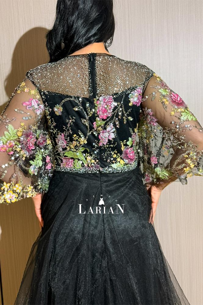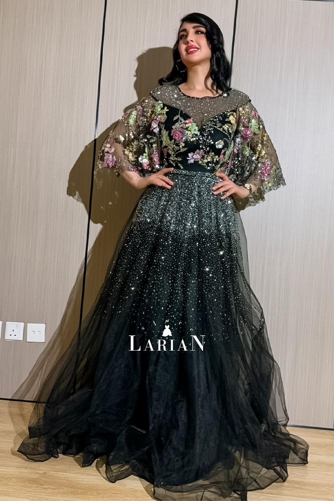 فستان سهره اسود ممزوج بورود جذابه وفصوص متناثره من لاريان ستور على طبقات من التل تعطي لمسه جذابه .