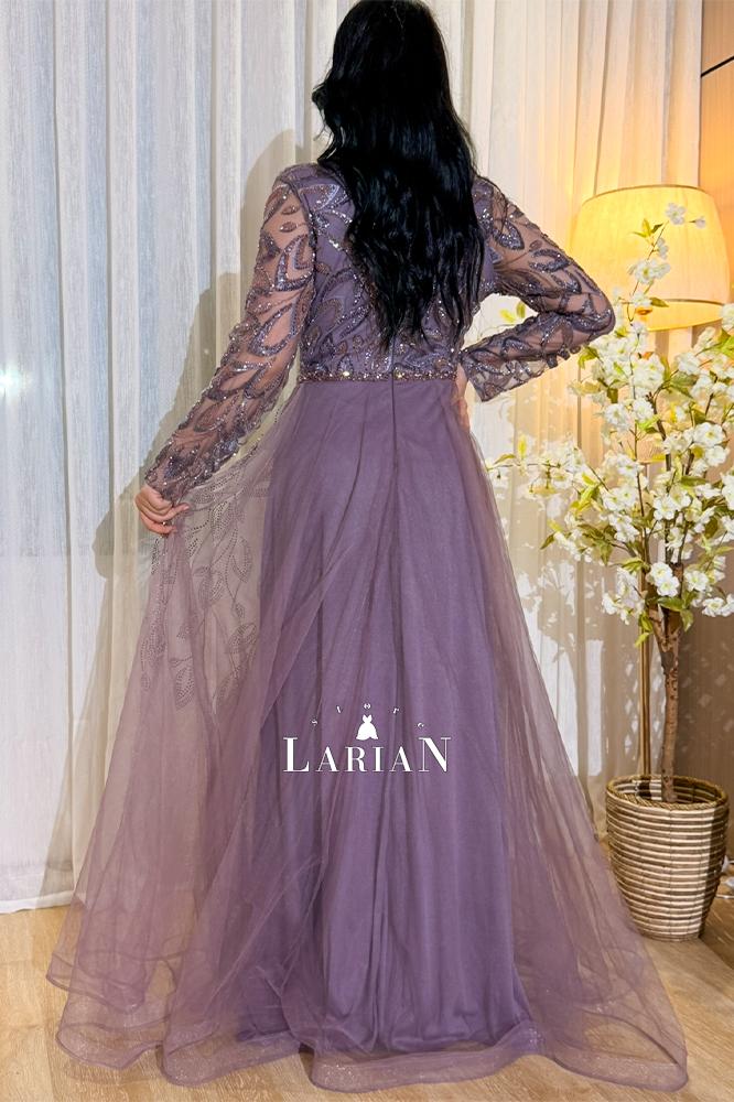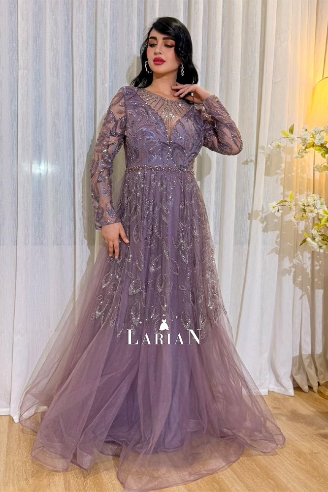 فستان سهره موف فخم من لاريان ستور بقصه A_LINE ناعمه مصنوع من طبقات تل تنسدل بانسيابيه راقيه الجزء العلوي مزخرف بفصوص فاخره.